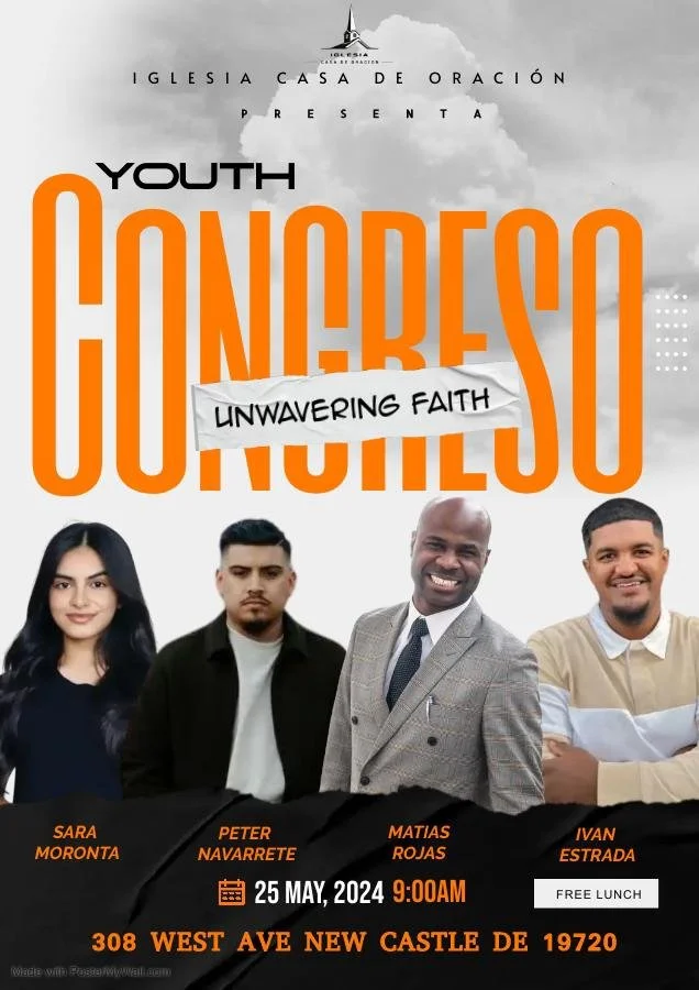 Get ready for a day filled with inspiration and growth at our Youth Conference themed "Unwavering Faith." We are excited to have guest worshiper Peter Navarrete leading us in worship, along with guest speakers Matias Rojas, Ivan Estrada, and Sara Moronta sharing powerful messages.